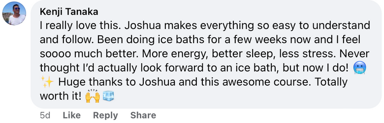 You gain access to a community of other ice bathers who have also purchased the course. There, you can share experiences, ask questions, and encourage each other. Additionally, course instructor Joshua Roxendal will answer questions in live Q&A sessions!